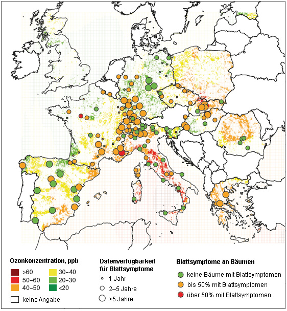 Die langfristigen durchschnittlichen Ozonkonzentrationen während der Vegetationsperiode (April bis September) zeigen, dass die Ozonwerte in den Wäldern Europas im Zeitraum zwischen 2000 und 2014 von Nord nach Süd zunehmen. Im Durchschnitt lagen die Werte bei 36,2 ppb, mit einem Schwankungsbereich von 14,5 bis 70,1 ppb (Abb. 3). Die höchsten Ozonkonzentrationen in der Luft wurden in Italien, im Tessin, in Tschechien, in der Slowakei, in Rumänien und in Griechenland gemessen.
