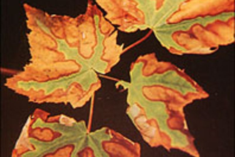 Abb. 1 - Sichtbare Ozonschäden auf einem Feldahorn-Blatt (Acer campestre). Die dunklen Punkte sind kollabierte Zellen, deren Zellwände durch Ozon oxidiert worden sind.
