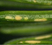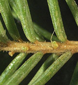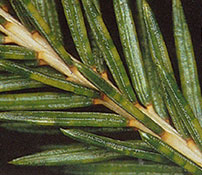 Feine gelbe Sprenkelung an Fichtennadeln, experimentell hervorgerufen durch Ozon (Foto Hartmann)