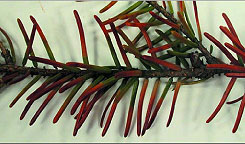 Fichte: Am Beispiel akuter Schwefeldioxidschäden zeigt sich klar die Notwendigkeit genauer optischer Analysen. Kräftige Nadelverfärbungen von gelb bis braun können viele andere Ursachen, wie z.B. Frost oder Frühbefall durch Hallimasch, haben.