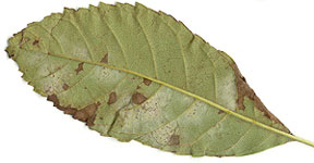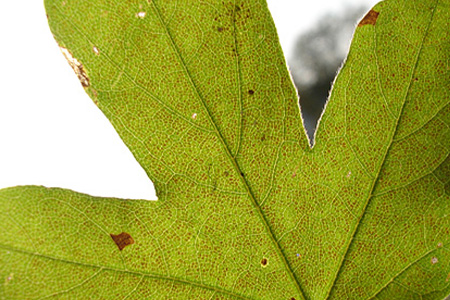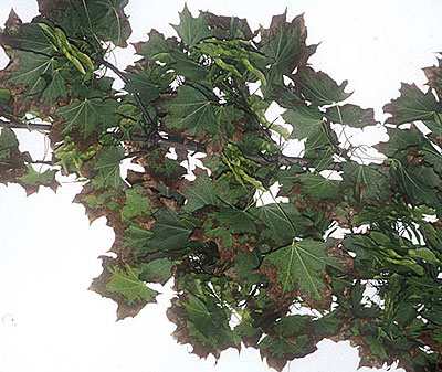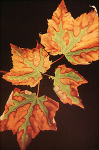 Blattnekrosen an Ahorn, hervorgerufen durch Schwefeldioxid