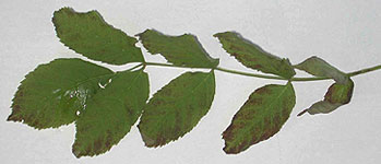 Esche: Vergleichsweise einfach ist der Nachweis von Ozon-Symptomen bei der europäischen Esche. Hier ist die rötliche Verfärbung der Blätter besonders deutlich ausgeprägt. Die meisten Pilzkrankheiten der Esche erzeugen scharf abgegrenzte Flecken.