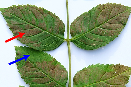 Ozonschäden manifestieren sich an Blättern von Laubgehölzen als flächige oder fein punktierte Rötungen zwischen den Adern. Allerdings können auch frühe Stadien bestimmter Pilzkrankheiten ähnliche Schadbilder aufweisen. Die Ozon induzierten Symptome sind aber im Gegensatz zu den durch Pilze hervorgerufenen Blattflecken nur auf der Blattoberfläche sichtbar.