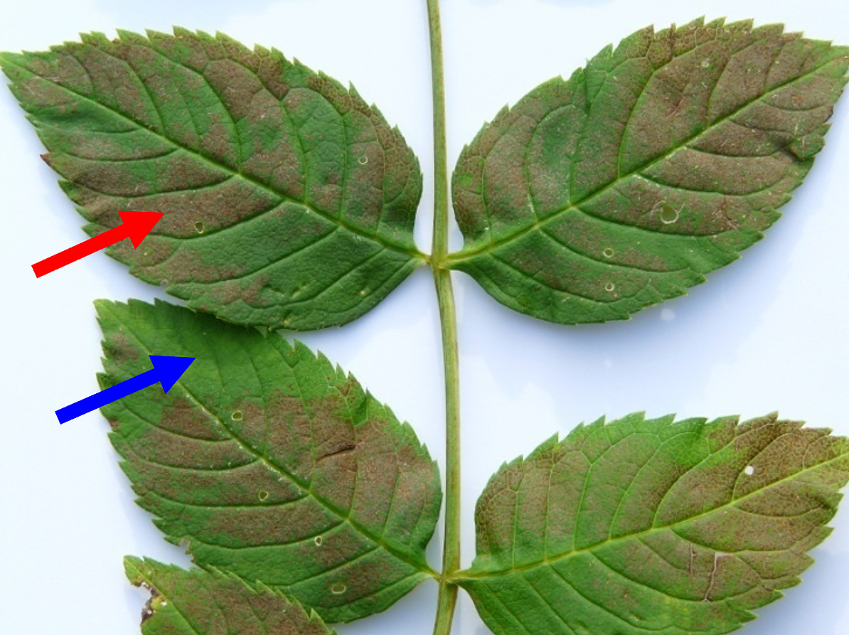 Die Punkte werden mit der Zeit gelblich oder rot und schliesslich braun oder schwarz, d.h. nekrotisch. Die Zellen dieser Punkte sind geschädigt oder abgestorben. Je nach Pflanzenart äussern sich erste Ozonsymptome als diffuse bronzefarbige Verfärbung, welche sich später zu braunen Nekrosepunkten entwickelt. Arten mit homogener Verrötung oder Vergilbung sind schlechtere Indikatoren für Ozon, da sie von ähnlichen Verfärbungen durch klimatische Veränderungen, Nährstoffmangel im Laufe der Blattentwicklung oder von der Herbstverfärbung unterschieden werden müssen.