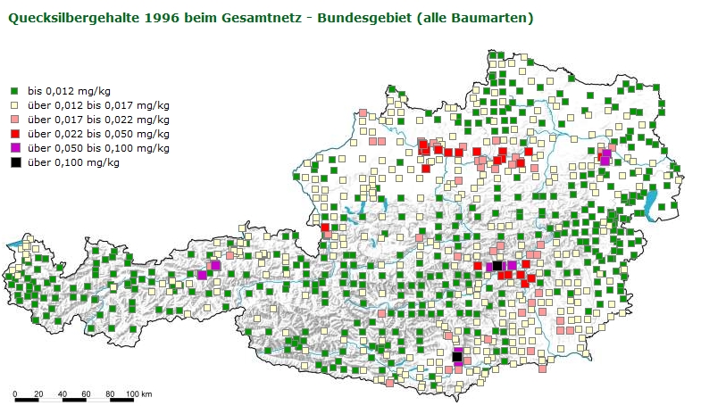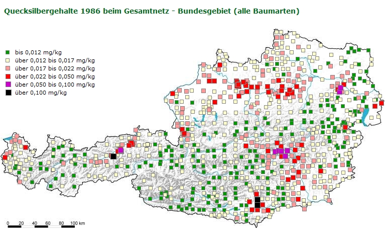 Seit 1986 liegen auch die Quecksilberwerte aus dem Österreichischen Bioindikatornetz für dieses Gebiet vor: Beide Ergebnisse, aus der Stammscheibe und aus dem Österreichischen Bioindikatornetz, zeigten übereinstimmend keine nennenswerten Quecksilberbelastung für diese Periode. Grundsätzlich ist die Liste von Punktquellen im Annex D des Minamata-Übereinkommens auch ein guter Anhaltspunkt; dort werden Kohlekraftwerke, kohlebefeuerte Industrie-Boiler, Schmelz- und Röstprozesse von Nichteisenmetallen, Müllverbrennungsanlagen und Produktionsanlagen für Zementklinker als mögliche Punktquellen für Quecksilber gelistet (United Nations Environment Programme 2019).