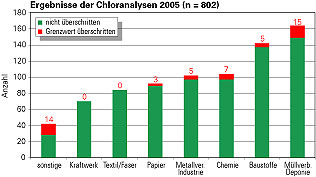 Abbildung 1: Anzahl der Chloranalysen von Fichtenproben und Anzahl der Proben mit Grenzwertüberschreitung (2005, ohne Streusalzuntersuchungen), gegliedert nach Emittenten