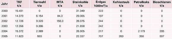 Wichtig ist eine genaue Eingangskontrolle dieser alternativen Brennstoffe. So sind unter anderen die Gehalte an Quecksilber, Blei, Cadmium und Chrom sowie an Chlor von Interesse. In Tabelle 1 sind die Einsatzmengen von Brennstoffen und Ersatzbrennstoffen angegeben, die in einem Zementwerk im Drehrohrofen beim Zementklinkerprozess verwendet werden.