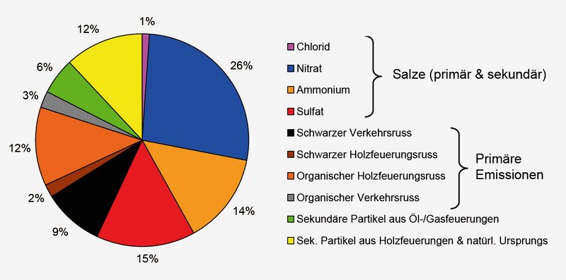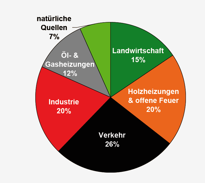 Feinstaub besteht aus Partikeln mit einem Durchmesser von weniger als 10 Tausendstel Millimetern, was etwa einem Zehntel des Durchmessers eines menschlichen Haars entspricht. Die auch als PM10 bezeichneten Luftschadstoffe gelangen einerseits als primäre Partikel in die Atmosphäre – so zum Beispiel bei der unvollständigen Verbrennung von Brenn- und Treibstoffen, bei industriellen Prozessen sowie durch den Abrieb von Reifen, Strassenbelägen und Bahnschienen. Bei den Brennstoffen fallen besonders die Partikel aus der Verbrennung von Holz und Holzabfällen ins Gewicht. Daneben gibt es auch sekundäre Partikel, die sich erst in der Luft aus gasförmigen Stoffen wie Ammoniak, Stickoxiden, Schwefeldioxid und organischen Verbindungen bilden. Sind die Teilchen kleiner als 1 Tausendstel Millimeter, spricht man von PM1.