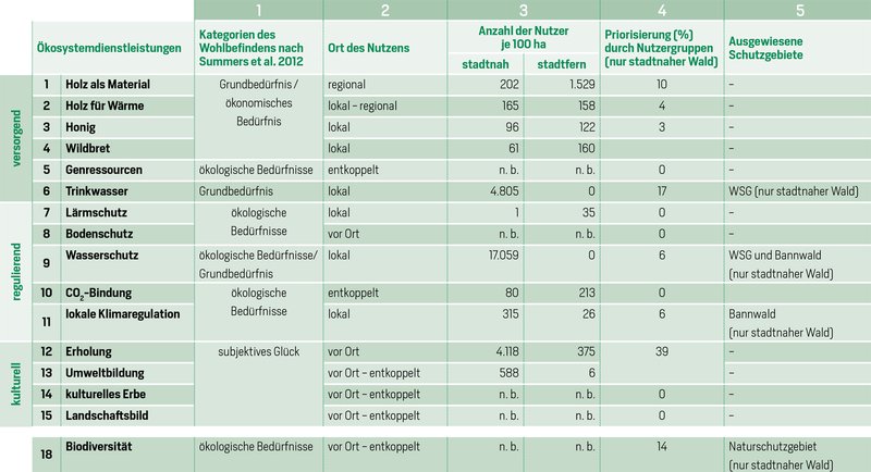 Beim Vergleich des stadtnahen und stadtfernen Waldes in Tabelle 2 zeigen sich sehr unterschiedliche Strukturen bei der Anzahl der Nutzer und den ausgewiesenen Schutzgebieten. Im stadtfernen Wald erfolgt keine Wasserentnahme, es gibt keine Hotspots der Biodiversität, die Erholungsnutzung ist wesentlich geringer und es sind keine Schutzgebiete ausgewiesen. Dafür zeigt die Zahl der Nutzer, dass im stadtfernen Wald die Bedeutung der versorgenden ÖSD, besonders von Holz als Material, und der regulierenden Leistungen CO2-Bindung und Lärmschutz höher ist. In Abb. 3 wurde bereits gezeigt, dass beide Waldgebiete eine hohe Multifunktionalität aufweisen, d. h. viele Leistungen gleichzeitig bereitgestellt werden. Die Unterschiede im Nutzen machen deutlich, dass die einzelnen Leistungen in einem ÖSD-Bündel nicht immer gleichwertig betrachtet werden können, sondern je nach Lage verschiedene Rangfolgen haben. Die multifunktionale Forstwirtschaft hat im stadtfernen Wald eine "klassische", an der Holznutzung ausgerichtete Ausprägung, während sie im stadtnahen Wald je nach räumlicher Lage primär an Wasserschutz, Erholungsnutzung und/oder Naturschutz ausgerichtet werden muss, allerdings ohne auf die Bereitstellung anderer Leistungen zu verzichten.