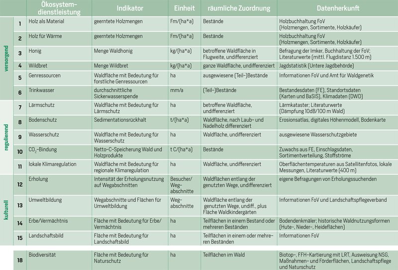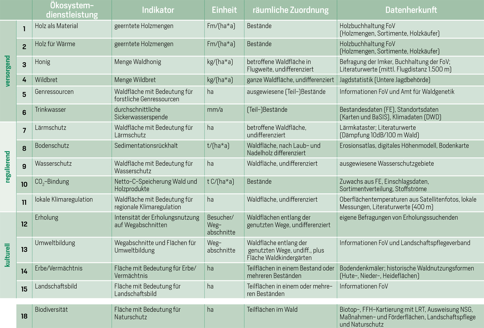 Bei einem Auftaktworkshop mit lokalen Nutzergruppen wurden alle als wichtig erachteten ÖSD gesammelt, klassifiziert und gruppiert. Nach Prüfung gegenüber den ausgewiesenen Funktionen der aktuellen Waldfunktionspläne wurden 15 ÖSD ausgewählt (s. Tab. 1). Für jede dieser ÖSD wurde die Leistung quantifiziert und die Orte der Bereitstellung erfasst. Um eventuelle Schwankungen der ÖSD zu berücksichtigen, wurden nach Möglichkeit mittlere Werte für einen zehnjährigen Zeitraum (2006 bis 2015) ermittelt.