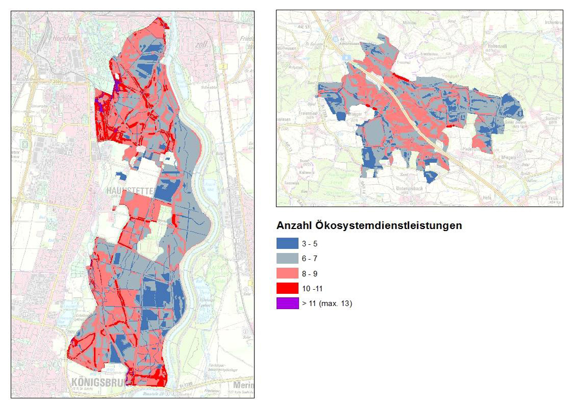 Wenn alle Karten mit den Orten der ÖSD-Bereitstellung übereinandergelegt werden, ergibt sich die Anzahl der bereitgestellten ÖSD (Abb. 3). Im stadtnahen Waldgebiet finden sich gleichzeitig bis zu 13 der 15 erfassten ÖSD, im stadtfernen Waldgebiet maximal 10. Die mittlere Anzahl liegt in beiden Gebieten ähnlich bei 7,2 bzw. 6,8, das Minimum ist jeweils 3. Es zeigen sich deutliche räumliche Schwankungen der ÖSD-Anzahl; eine Häufung findet sich im zentrumsnahen, nordwestlichen Bereich des stadtnahen Waldes. Durch die Überlagerung der oben beschriebenen Muster pausen sich öfters die Flächen entlang der Wege durch, was durch die Ballung der kulturellen Leistungen Erholung, Umweltbildung und teilweise Landschafsbild hervorgerufen wird. Die auftretenden Strukturen haben dabei nur noch wenig mit den ausgewiesenen Beständen der Forsteinrichtung gemein.