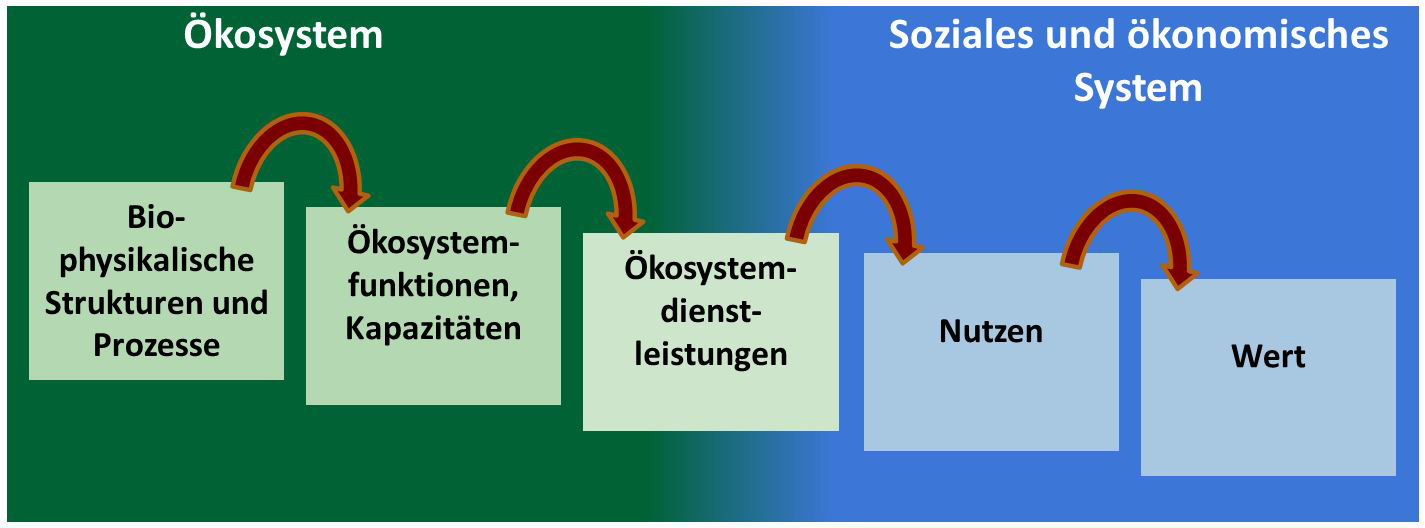 Obwohl meist von dem Konzept der ÖSD gesprochen wird, gibt es kein festgeschriebenes, einheitliches Regelwerk. Stattdessen gibt es ein ständig weiterentwickeltes Set verschiedener Prinzipien oder Werkzeuge, mit denen ÖSD je nach Fragestellung erfasst werden. Die Beziehung zwischen natürlichen und sozioökonomischen Systemen wird mit der ÖSD-Kaskade (Abb. 1) beschrieben: Aus biophysikalischen Strukturen und Prozessen des Ökosystems ergeben sich Funktionen, welche die Kapazität für die Bereitstellung von Leistungen schaffen.