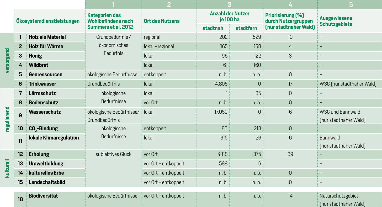 Die bisher gezeigten Ergebnisse ergeben eine auf lokalen Daten basierende, hochaufgelöste Karte dessen, was das Ökosystem Wald liefert. Um sich dem Nutzen für den Menschen und einer nicht monetären Bewertung der untersuchten ÖSD anzunähern, können unterschiedliche Indikatoren herangezogen werden (Tab. 2): Der erste Indikator beschreibt, zu welchen Kategorien des Wohlbefindens die ÖSD beitragen; sie können demnach Grundbedürfnisse, ökologische oder ökonomische Bedürfnisse befriedigen oder zum subjektiven Glück beitragen. Dabei gibt es diverse Überschneidungen, beispielsweise befriedigt Holz das Grundbedürfnis nach Rohstoffen oder Wärme, aber auch ökonomische Bedürfnisse. Nach Maslow gibt es eine Hierarchie der Bedürfnisse, der zufolge die Befriedigung grundlegender menschlicher Bedürfnisse wie Trinkwasser oder Nahrung der erste Schritt auf dem Weg zur Selbstverwirklichung ist.