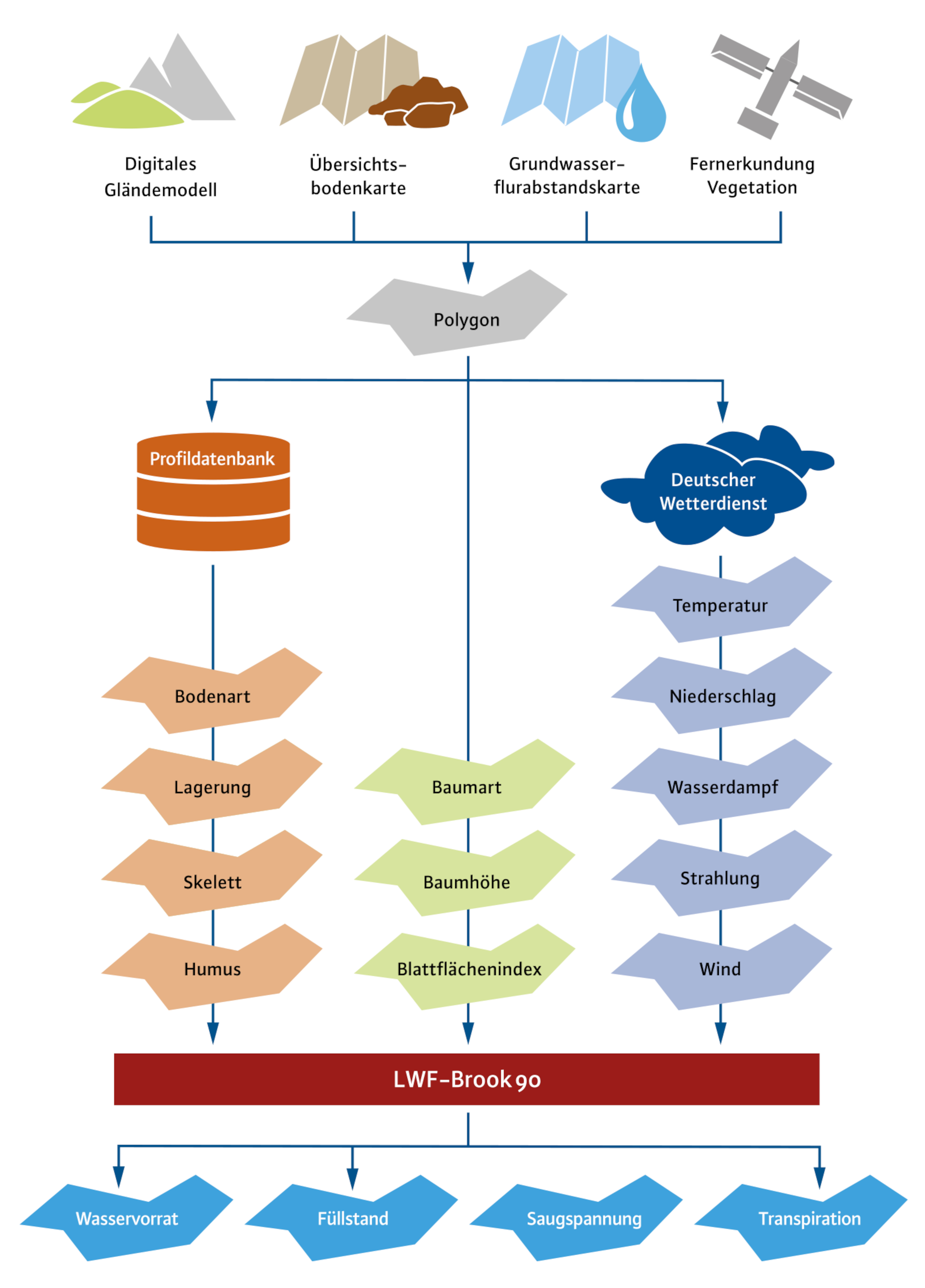 Abb 2: Die Polygone für den WaldDürreMonitor werden mit Hilfe der Übersichtsbodenkarte 1:25.000, einem digitalen Geländemodell, der Grundwasserflurabstandskarte sowie Bestandesinformationen aus der Fernerkundung abgeleitet. Pro Polygon werden bodenphysikalische Grunddaten, Baumkenngrößen und Wetterdaten als Eingangsparameter für das Wasserhaushaltsmodell LWF-Brook90 verwendet. Daraus werden Indikatoren für den täglichen Wasservorrat im Boden, den Füllstand des Bodenwasserspeichers (% nFK), die Saugspannung im Boden sowie der Transpirationsindex berechnet.