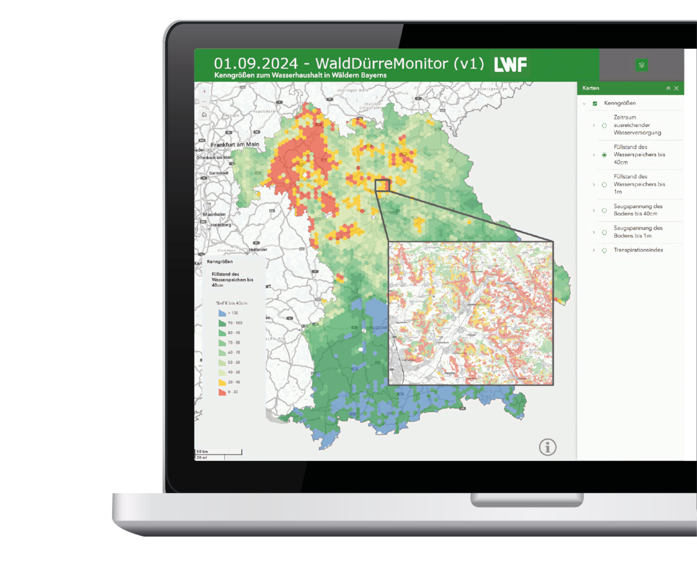Die Landesanstalt für Wald und Forstwirtschaft (LWF) bietet mit dem WaldDürreMonitor Bayern ein auf den Waldbesitzer zugeschnittenes Online-Tool an, das die Wasserversorgung der bayerischen Wälder tagesaktuell visualisiert. Die Karten, die aus über einer Million einzelner Polygone erstellt werden, zeichnen sich durch eine deutlich höhere räumliche Auflösung als vergleichbare Produkte anderer Institutionen aus. Außerdem fließen standörtliche Informationen über den Baumbestand mit in die Modellierungen ein. Die Bodenfeuchtekarten werden künftig einen bedeutenden Beitrag zur Diskussion über die Wasserversorgung der Wälder leisten.
