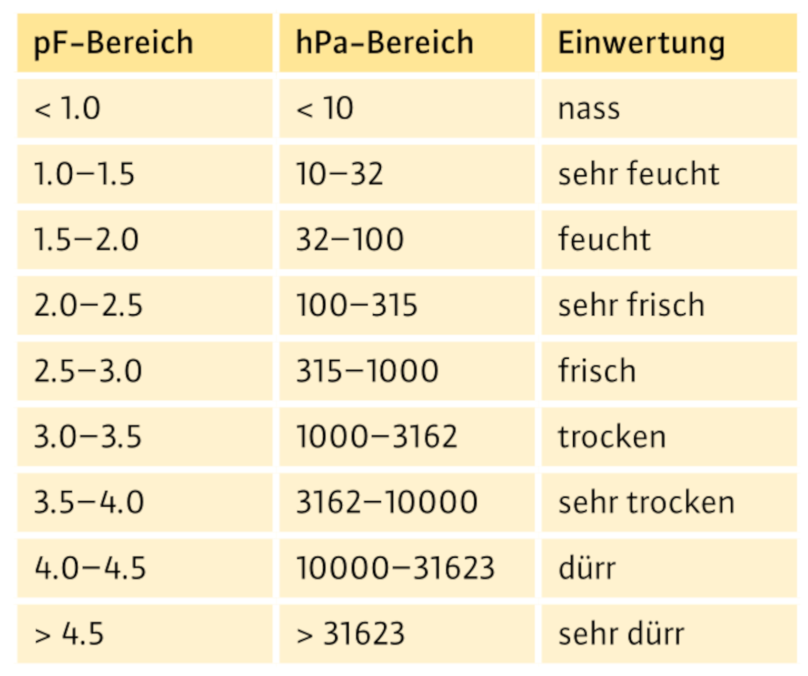 - Saugspannung: Beschreibt die Kräfte, durch die Wasser mittels Kapillarkräften und Adhäsion an Bodenpartikeln gebunden wird. Synonym verwendet man auch den Begriff Matrixpotenzial. Der sogenannte pF-Wert wird als logarithmisches Maß für die Saugspannung herangezogen: Bei der Feldkapazität liegt er bei 1,8 und am Welkepunkt bei 4,2.