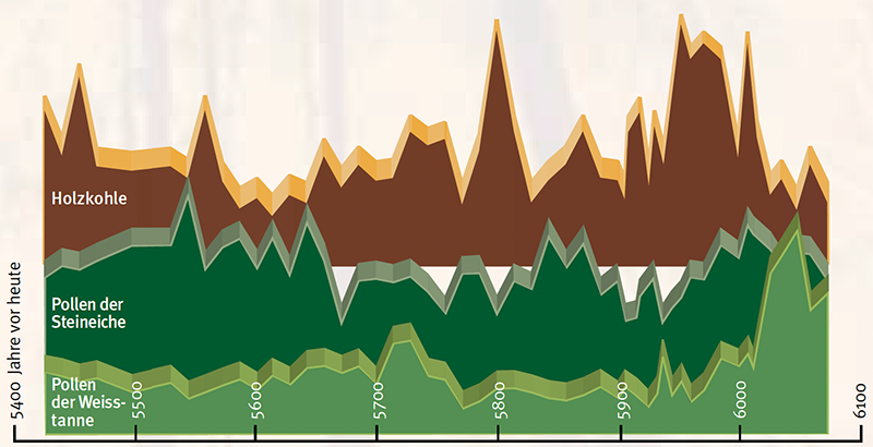 Abb. 5. Wie die Sedimentanalysen zeigen, haben Waldbrände – sichtbar an den hohen Kohlenanteilen in manchen Sedimentschichten – den Weisstannenbestand über die Jahrtausende sukzessive verringert, während sich die immergrünen Steineichen jeweils rasch wieder erholten.