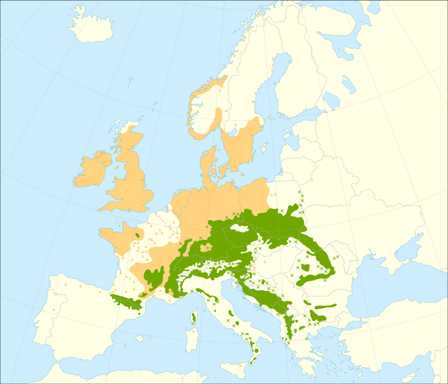 Abb. 4. Heutige Verbreitung Natürliches Verbreitungsgebiet (grün) der Weisstanne (Abies alba). Quelle: euforgen.org