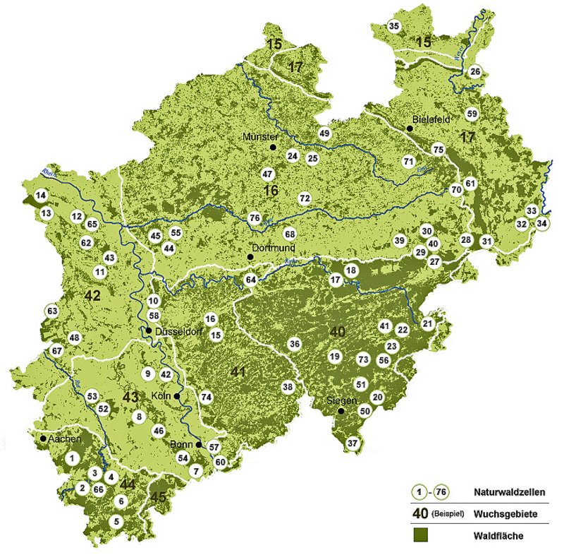 Die Naturwaldzellen repräsentieren alle in NRW vorkommenden Waldgesellschaften und ihre Standorte: sowohl seltene Waldtypen oder Wald auf Extremstandorten, als auch wichtige, flächig verbreitete naturnahe Wälder auf mittleren und guten Standorten. Im Netz der ausgewiesenen Naturwaldzellen sind bis heute fast alle in den sieben forstlichen Wuchsgebieten vorkommenden natürlichen Waldgesellschaften abgebildet: