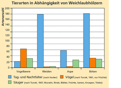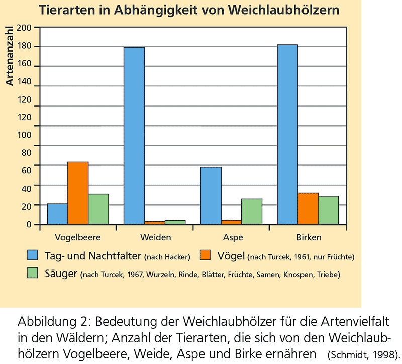 Bedeutsam für die Artenvielfalt in unseren Wäldern sind die Weichlaubhölzer. Dabei werden Vogelbeere, Weide, Aspe und Birke von den Tierartengruppen unterschiedlich genutzt (Abb. 5). Während die Vogelbeere für Vögel sehr interessant ist, haben Weiden und Birken einen besonderen Stellenwert für Schmetterlinge. Birken bieten mit ihren Kätzchen auch noch einigen Vogelarten Nahrung (z.B. Birkenzeisig, Erlenzeisig, Haselhuhn).