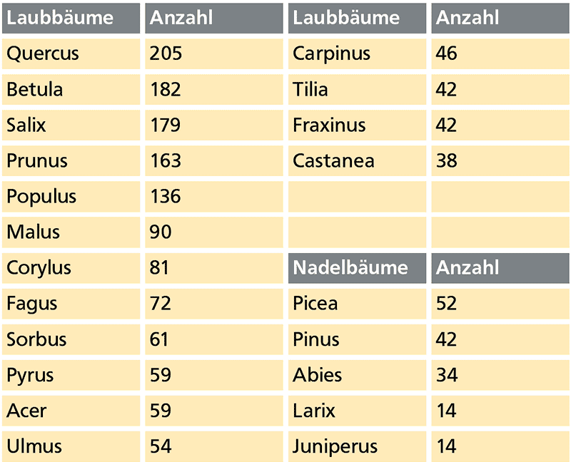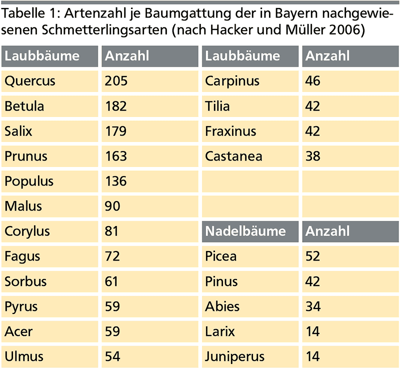 Von den 2.983 bayerischen Schmetterlingsarten leben 955 Arten an Laub- und 116 Arten an Nadelbäumen. Am beliebtesten ist dabei die Eiche, vor Birke und Weide. Relativ wenige Arten leben an Lärche, Wacholder und Eibe (Tab. 1). In den bayerischen Naturwaldreservaten konnten bisher rund 70 Prozent aller bayersicher Schmetterlingsarten nachgewiesen werden, in den vier Untersuchungsgebieten in Hessen 427 Großschmetterlingsarten.