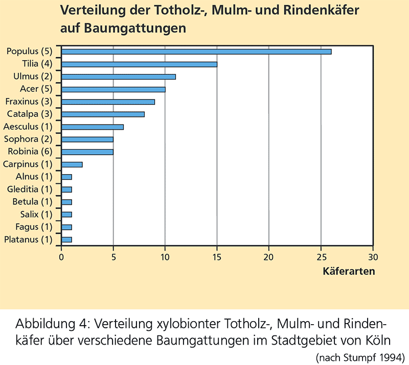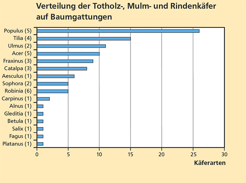 Für die xylobionten Käferarten ist aber weniger die Baumart als vielmehr der Zersetzungszustand des Holzes entscheidend. Totholz-, Mulm- und Rindenkäferarten treten am artenreichsten dort auf, wo große Mulmhöhlen in Bäumen entstehen können. Hier werden von den Totholzkäfern zum Beispiel Pappel, Linde und Ulme aber auch fremdländische Baumarten wie Rosskastanie, Trompetenbäume (Catalpa), Schnurbäume (Sophora) und Robinien (Robinia) genutzt (Abb. 4).