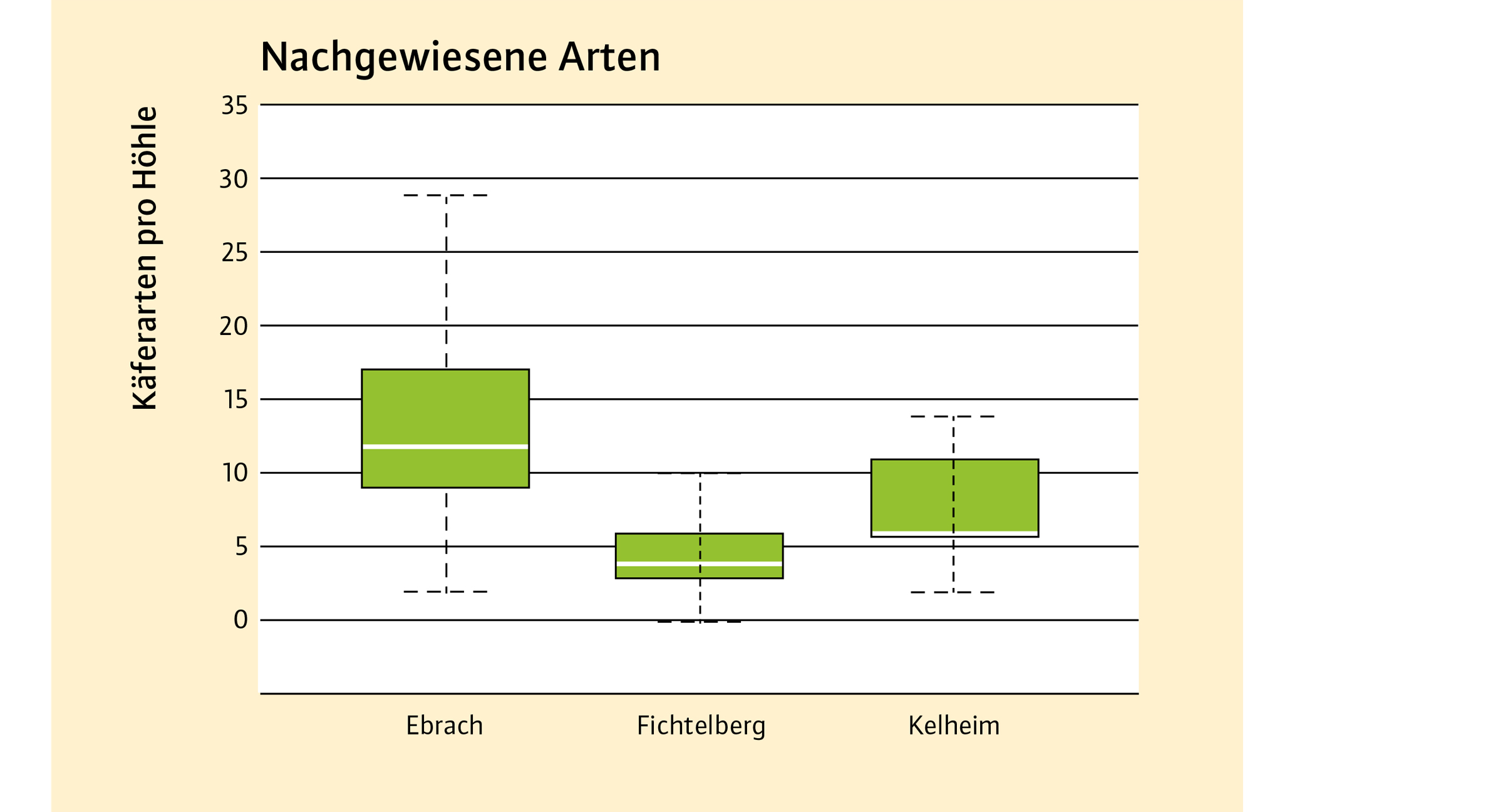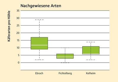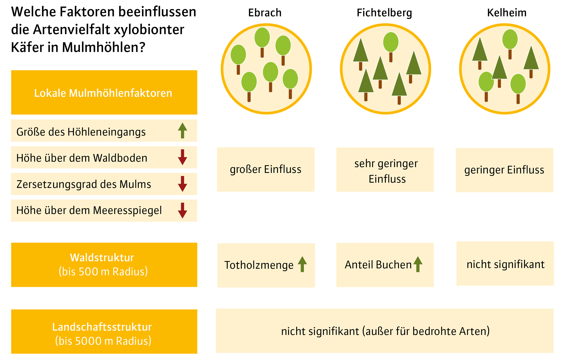 Mulmhöhlen im Forstbetrieb Ebrach wiesen die größte Artenvielfalt pro Höhle auf (im Durchschnitt 13,2 Käferarten pro Höhle, Fichtelberg: 4,6, Kelheim: 7,9), wie auch die höchste Anzahl gefährdeter Arten und Mulmhöhlenspezialisten. Es zeigte sich, dass die Artenvielfalt besonders von den lokalen Eigenschaften der Mulmhöhlen selbst sowie der Höhlenbäume beeinflusst wurde (Abbildung 2). So fanden sich z. B. mehr Käferarten in Mulmhöhlen mit großflächigen Höhleneingängen und in bodennahen Höhlen. Weiterhin waren in Höhlen mit noch gering zersetztem und dementsprechend hellerem und grobkörnigerem Mulm mehr Käferarten als in Höhlen mit bereits stärker zersetztem Mulm. Der noch frische Mulm kann wahrscheinlich von einer größeren Zahl auch generalistischer xylobionter Arten genutzt werden, während den stark zersetzten, dunklen Mulm vorwiegend wenige Spezialisten dieser Zersetzungsstadien annehmen.