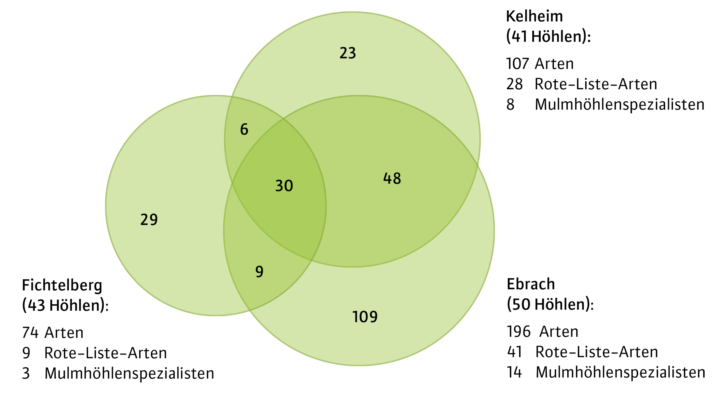 In den 134 beprobten Mulmhöhlen der drei Untersuchungsgebiete wurden insgesamt 283 xylobionte Käferarten aus 48 Familien gesammelt (5.880 Individuen). Davon stehen 62 Arten auf der Roten Liste, was einem Anteil bedrohter Arten von 22 % entspricht. 16 Arten wurden als Mulmhöhlenspezialisten identifiziert, die alle auf der Roten Liste stehen. Die Anzahl nachgewiesener Arten sowie die Zusammensetzung der Artengemeinschaften unterschied sich teilweise deutlich zwischen den drei untersuchten Waldgebieten (Abbildung 3 und 4).