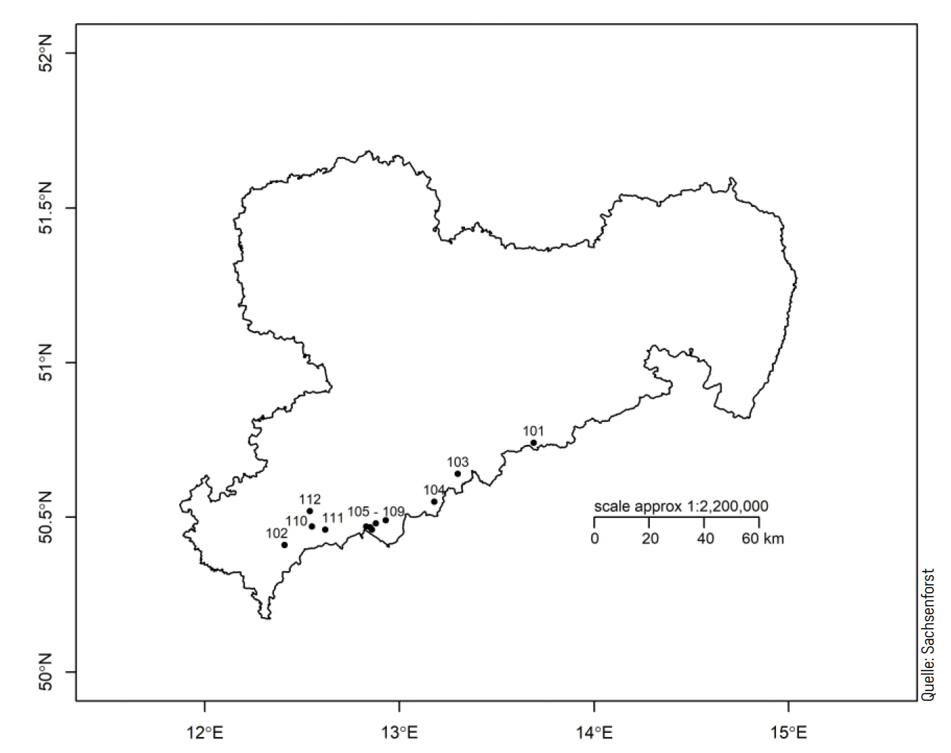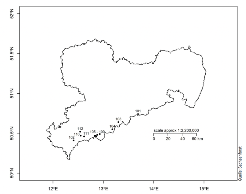 Grundlage für die Untersuchung bildete das Versuchsflächensystem der Baumart Gemeine Fichte im Erzgebirge. Es wurden zwölf Probeflächen mit einer Größe von jeweils 0,5 bis 1,0 ha ausgewählt (Abb. 2). Anschließend wurden im Umfeld Horste bzw. Kleinbestände weiterer Baumarten gesucht und Probeflächen in möglichst vergleichbarer Flächengröße festgelegt. Dabei handelte es sich zum einen mit Rot-Buche und Berg-Ahorn (Abb. 1) um die Hauptbaumart und eine wesentliche Mischbaumart des Hainsimsen-Buchenwaldes, welcher im Erzgebirge bis in die Hochlagen die bestimmende natürliche Waldgesellschaft darstellt. Zum anderen erfolgten die Untersuchungen auf Gemeiner Eberesche, einer Mischbaumart im Reitgras-Fichtenwald, der dominierenden natürlichen Waldgesellschaft in den Kammlagen. Die ausgewählten Probeflächen decken mit einer Meereshöhe von 550 bis 940 m die Klimastufen der Mittleren und Höheren Berglagen sowie die Kammlagen ab.