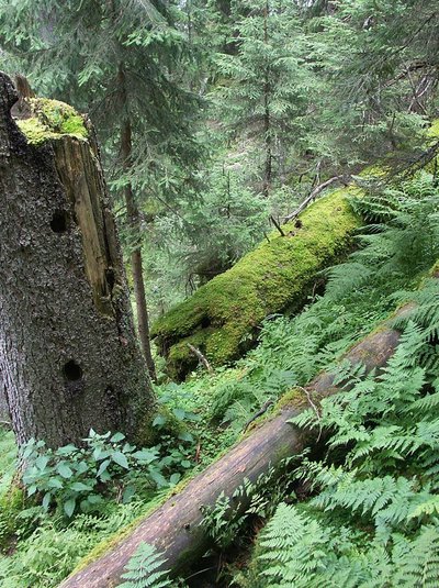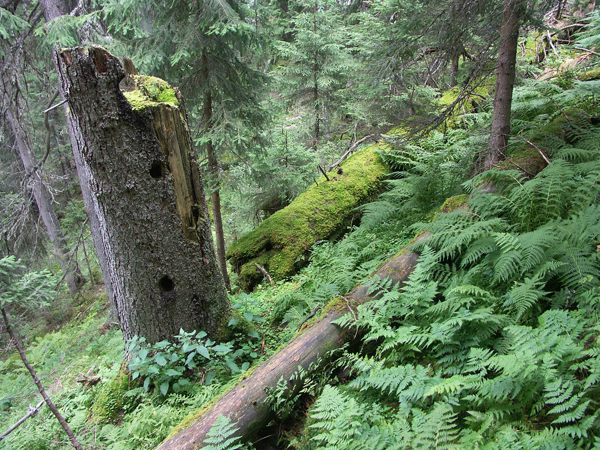 Natürlich entstandenes Totholz (z. B. aus Windwurf, Insektenbefall usw.) nicht entfernen - Waldreservate ausscheiden