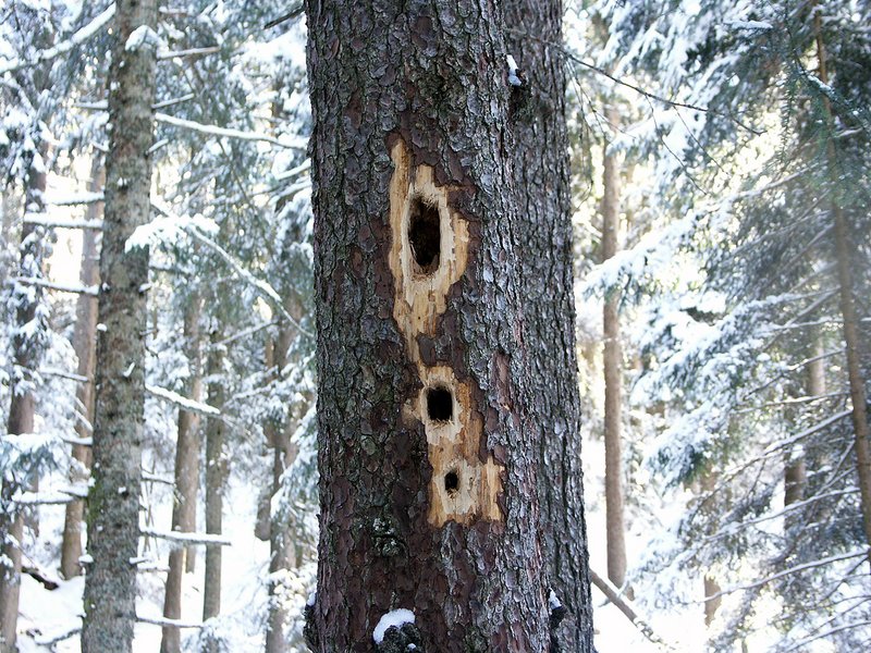 - Bäume mit Natur- und Spechthöhlen ("Höhlenbäume"), ausgehöhlten Stämmen, mit Mulmhöhlen, Rindentaschen