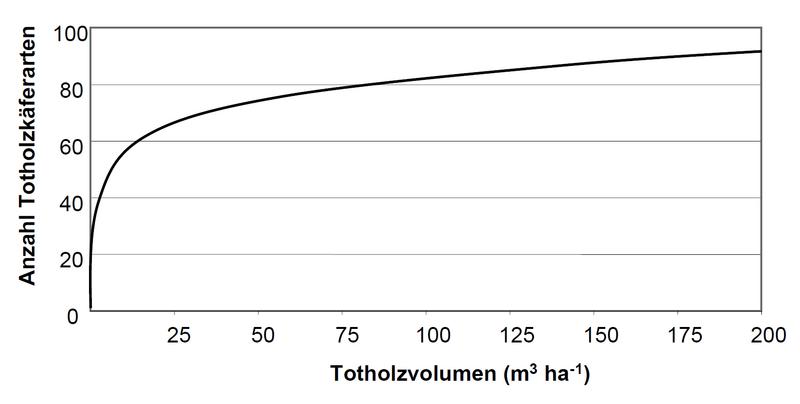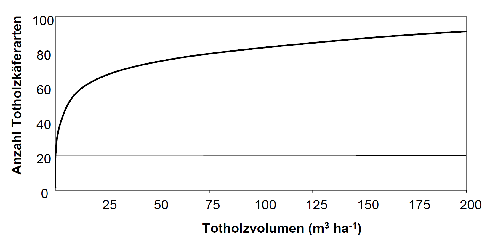 Abbildung 2 zeigt, dass die Artenzahl schon mit einer geringen Zunahme der Totholzmenge rasch ansteigen kann, wenn die verbleibenden Restvolumen niedrig sind. Förderungsmassnahmen wirken sich also besonders auch in Regionen mit sehr geringen Totholzvolumen positiv aus.