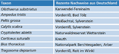 Die xylobionten Käfer an Fichte umfassen 300 bis 400 Arten. Allerdings beschränkt sich die Kenntnis meist auf Buchdrucker, Kupferstecher und Fichtenbock. Nur sehr wenige dieser Arten sind monophag an die Fichte gebunden. Die meisten Fichtenbesiedler nutzen auch andere Nadelhölzer als Brutbäume. Einige Urwaldreliktarten sind streng an Gebiete mit natürlichen Fichtenvorkommen gebunden. Acht dieser Arten sind innerhalb Deutschlands nur aus Bayern nachgewiesen (Tab. 1). Diese Arten sind flugfähig, kommen aber wegen einer anzunehmenden Bindung an klimatische Faktoren nur an wenigen isolierten Standorten mit autochthoner Fichte vor. Die prognostizierten milderen Winter gefährden vor allem die boreomontanen Reliktarten in den Alpen und in den Mittelgebirgen.