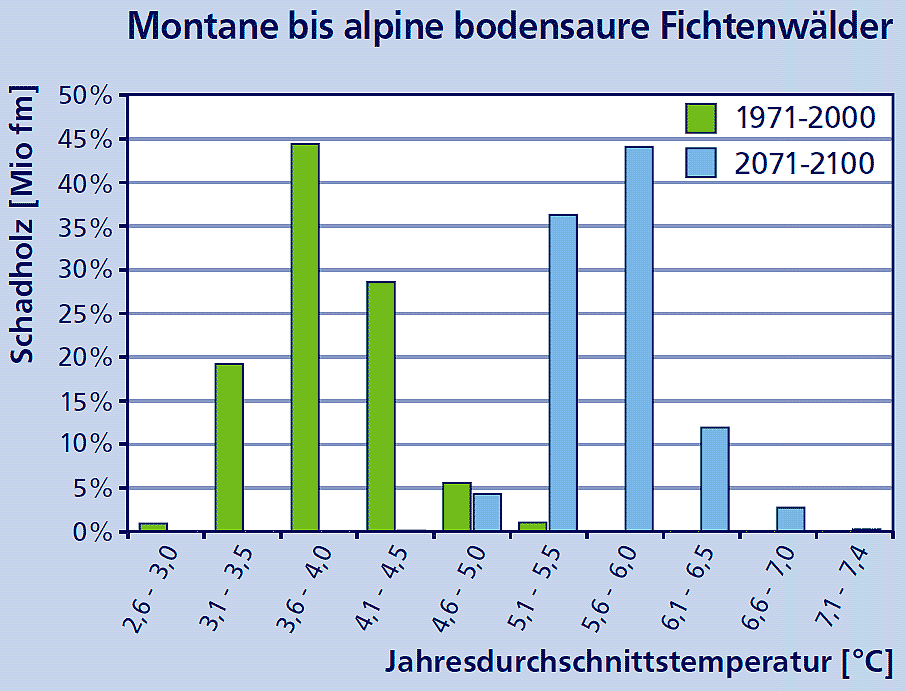 Aber auch in den Hochlagen der Mittel- und Hochgebirge wird der Klimawandel massive Folgen in den natürlichen Fichtenwäldern zeigen. Es ist nur eine Frage der Zeit, dass wärmeliebende Baumarten wie Rotbuche, Bergahorn und Weißtanne die Flächen des Lebensraumtyps erobern und nachhaltig verändern werden. Die Fichte wird in dem neuen Bergmischwald auch weiterhin eine Rolle spielen, wenngleich Störungen aufgrund von Borkenkäferbefall häufiger und intensiver werden dürften. Der von Kälte geprägte Hochlagenfichtenwald wird in vielen Mittelgebirgen stark an Fläche verlieren. Er wird bis auf sehr wenige Restflächen auf kältegeprägten Extremstandorten (kaltluft-erzeugende Blockhalden) oder dem Rand von Hochmooren verloren gehen.