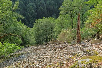 Nach Fritz und Lehnert (2007) bevorzugt die Aspisviper trockene, voll besonnte Blockhalden (Abb. 3), da die Sukzession hier nur langsam voranschreitet und ausreichend besiedelbare Hohlräume vorhanden sind. Bevorzugte Liegeplätze sind windgeschützte Nischen mit trockenem Laub in der Nähe von Gebüschsäumen und liegendem Totholz. Von Eichen und Haselnusssträuchern umsäumte Halden werden bevorzugt, unsere Ergebnisse suggerieren dagegen, dass das Vorhandensein von Haselsträuchern und -bäumen sich negativ auf das Vorkommen der Aspisviper auswirkt. Hierbei ist jedoch zu beachten, dass bei dieser Aufnahme nicht das generelle Vorkommen, sondern der Deckungsanteil betrachtet wurde. Betrachtet man hingegen die ökologische Funktion, so ist zu vermuten, dass sowohl Eichen als auch Haselsträucher eine gute Nahrungsgrundlage für Kleinsäuger liefern, welche wiederum als Beutetiere der Viper von Bedeutung sind. Wir fanden keine Bevorzugung von Habitaten mit liegendem Totholz, was darauf hindeutet, dass die Blockhalden bereits ausreichend Strukturen zum Versteck und zur Jagd bieten.