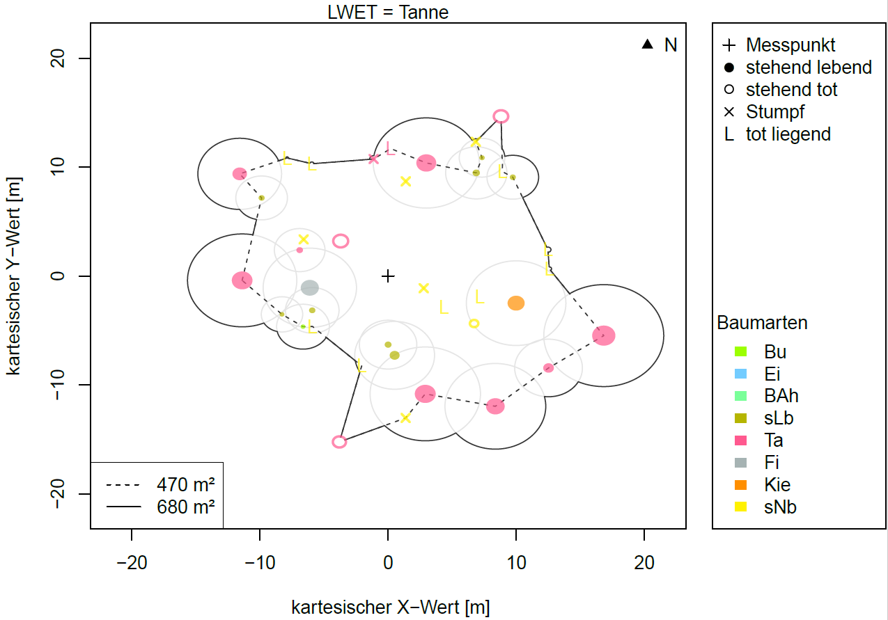 Abb. 2: Stammfußkarte einer Tannen-Habitatbaumgruppe. Von einem Messpunkt (+) aus wurden alle Bäume der Habitatbaumgruppe erfasst und eingemessen. Die Punktgröße spiegelt, um Faktor 2 überhöht, den BHD eines Baumes wider. Die Kronenschirmflächen (große Kreise mit grauem Rand) wurden für lebende Bäume artspezifisch mittels BHD aus Tabellenwerken abgeleitet.