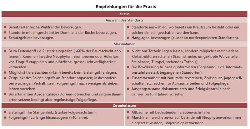 Die in den kommenden Jahren in zahlreichen Kantonen im Rahmen der Waldpolitik 2020 vom Bund unterstützten Aufwertungsmassnahmen bieten hierzu eine ideale Gelegenheit. Voraussetzung dafür ist jedoch eine systematische Erfolgskontrolle. Insbesondere die Dokumentation der Ausgangslage sowie eine Überprüfung der Wirksamkeit der Eingriffe sind dabei zwingend notwendig, damit fundierte Aussagen zu wichtigen Randbedingungen wie auch zur Effizienz der umgesetzten Massnahmen gemacht werden können. Nicht zuletzt könnten so die erreichten Erfolge gegenüber der zunehmend interessierten Bevölkerung besser kommuniziert werden.