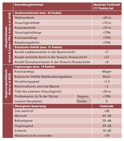 Die ökologische Qualität der ausgewählten Waldränder wurde jeweils mit dem Bewertungsschlüssel von Krüsi et al. (2010) ermittelt. Dieser erlaubt eine qualifizierte ökologische Einstufung von Waldrändern anhand struktureller und floristischer Kriterien (siehe Tab. 1) und ist in der kollinen sowie der montanen Stufe anwendbar. Weitere Parameter wie vorherrschende Waldgesellschaften, Exposition, Schutzstatus der untersuchten Waldränder sowie der angrenzenden Wald- und Offenlandflächen sowie die Bewirtschaftungsform vorgelagerter Landwirtschaftsflächen wurden den auf der kantonalen GIS-Plattform (AGIS) zur Verfügung stehenden Daten entnommen. Um die Gesamtpunktzahlen der untersuchten Waldaufwertungen mit gesamtschweizerischen Erhebungen vergleichen zu können, wurden sie entsprechend umgerechnet und statistisch ausgewertet (nähere Angaben dazu im Originalartikel.