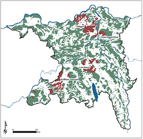 Abb. 2. Übersicht des Untersuchungsgebietes. Die Untersuchungsflächen liegen zwischen 300 und 700 m ü. M. und umfassen eine Fläche von 5'142ha. Grün: bewaldetes Gebiet; Dunkelrot: Waldflächen der ausgewählten Forstreviere Hintergrundkarte © Swisstop (DV084370), Daten Forstreviere: Departement Bau, Verkehr und Umwelt des Kantons Aargau, Abt. Wald (Stand Januar 2014)