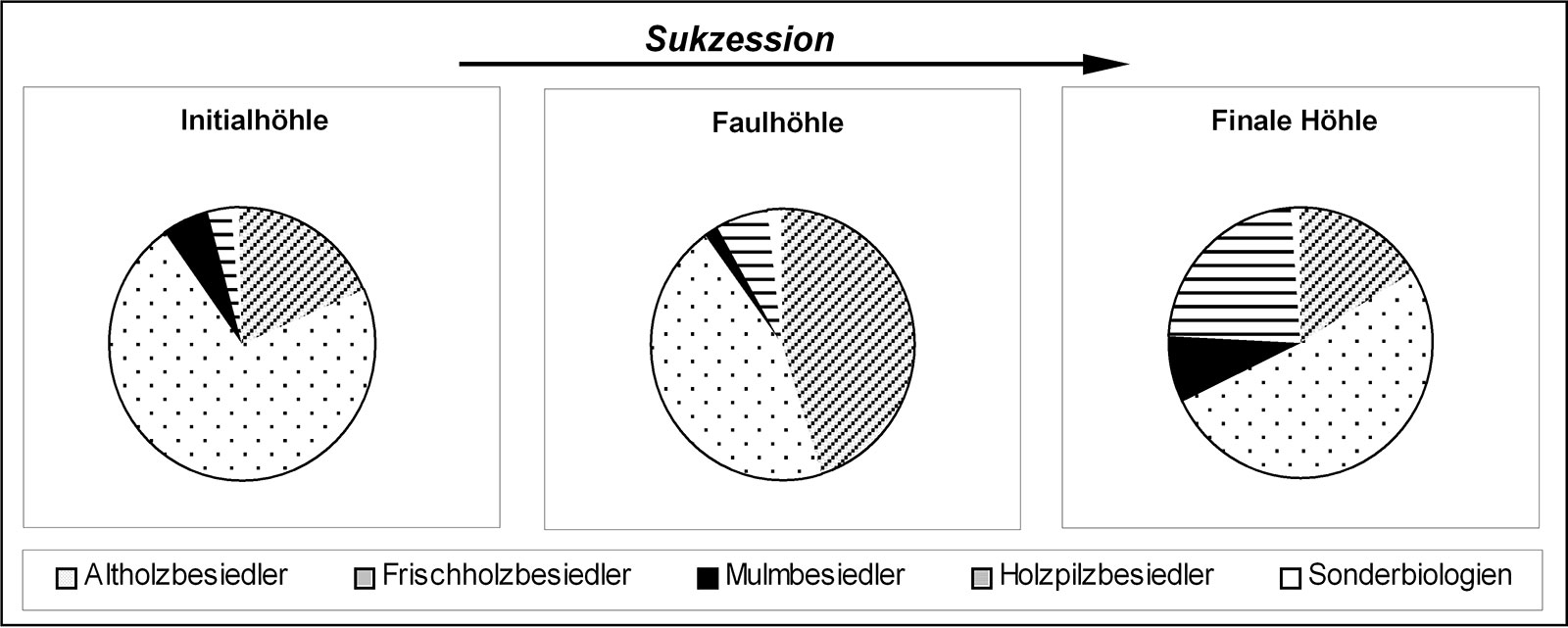 Mit fortschreitender Höhlensukzession (= Abfolge der verschiedenen Höhlenphasen) steigt das Substratangebot (Abb. 2). Damit verbunden ist ein Anstieg der Anzahl xylobionter Käferarten. Gleiches gilt auch für die Gruppe der Hautflügler und Wanzen. Bemerkenswert ist ebenso, dass der Anteil der Rote-Liste-Arten in finalen reifen Baumhöhlen über das doppelte höher liegt als in den Initialhöhlen. Sonderbiologien, vor allem von Käferarten, die in Hautflüglernestern leben, sind in Buchenhöhlen wegen des geringeren Wärmeangebots generell seltener. In Eichen dagegen steigt ihr Vorkommen in reifen Höhlen.