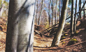 Abb. 7 - Ein Waldmeister-Buchenwald im Reservat "Schlossflue" oberhalb von Twann (BE) am Bielersee. Neben dieser auch im Mittelland weit verbreiteten Waldgesellschaft prägen diverse wärmeliebende und für den Jurasüdfuss typische Laubmischwälder das 68 Hektaren grosse Schutzgebiet. Forstliche Pflegeingriffe erfolgen hier nur noch, um die Verbuschung und Wiederbewaldung von artenreichen Lichtungen und Trockenwiesen zu verhindern.