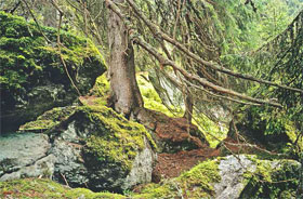 Abb. 1 - Dank seiner steilen und schwer zugänglichen Lage blieb der Blockfichtenwald Scatlè bei Brigels (GR) in der Surselva am Vorderrhein während Jahrhunderten von menschlichen Eingriffen verschont.Aus diesem Grund findet sich im ersten Waldreservat der Schweiz einer der letzten echten Fichtenurwälder in den Alpen.