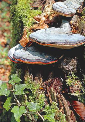 Abb. 4 - Höhere Pilze, wie der Rotrandige Baumschwamm (Fomitopsis pinicola) im jurassischen Naturwaldreservat "Bois Banal", sind die wichtigste Organismengruppe zum Abbau von Totholz.