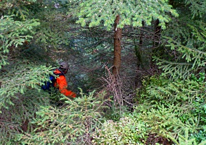 Abb. 4: Ein leuchtender Punkt im Grünen – Ein Mitarbeiter der FVA beim Aufsuchen von Stichprobenpunkten (Foto: FVA/Ballenthin)