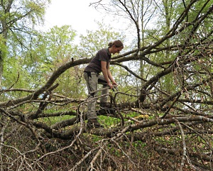 Abb. 1: Schön wild. Eine Mitarbeiterin der FVA misst den Durchmesser von liegendem Totholz. (Foto: FVA/Hoschek)