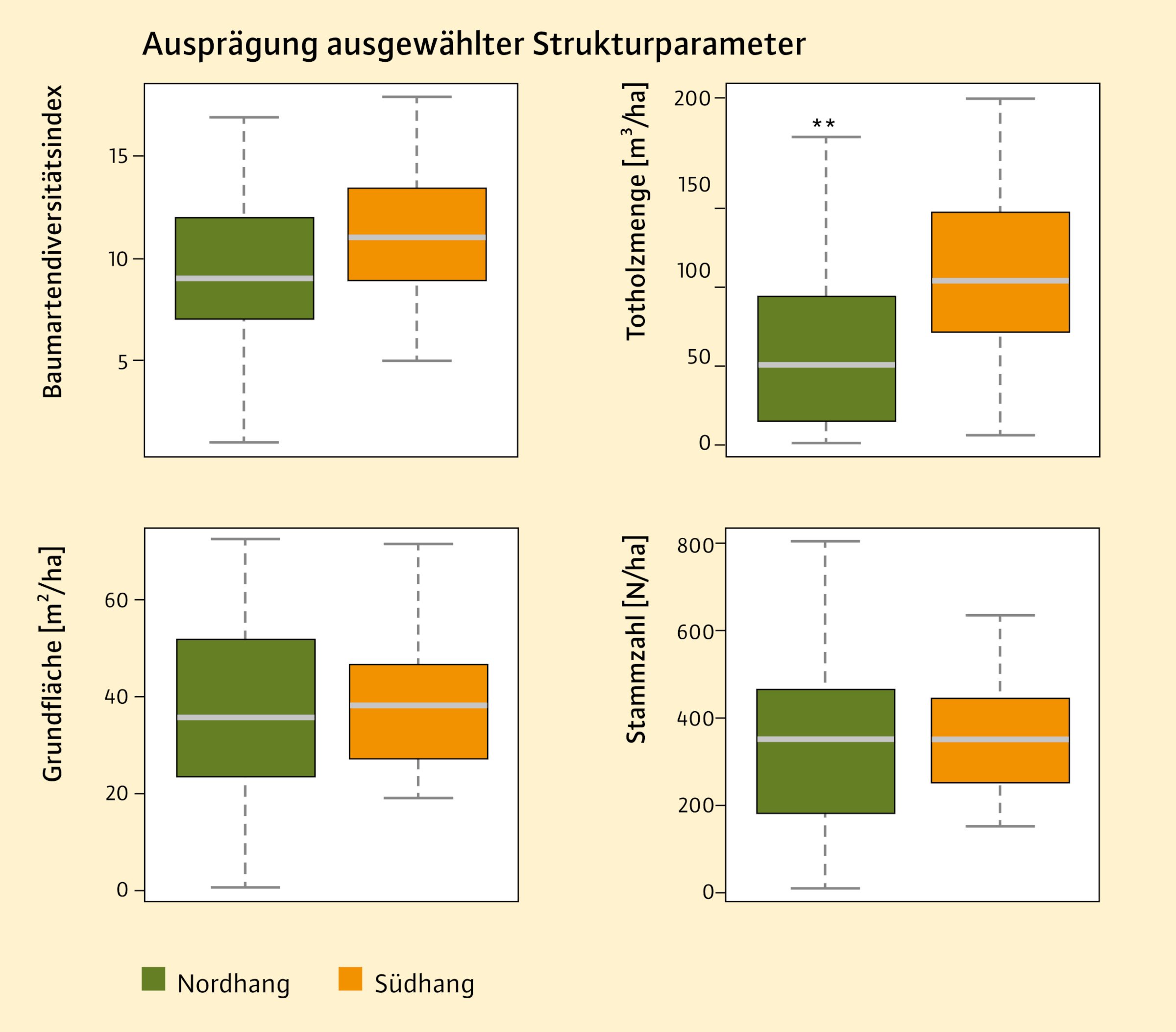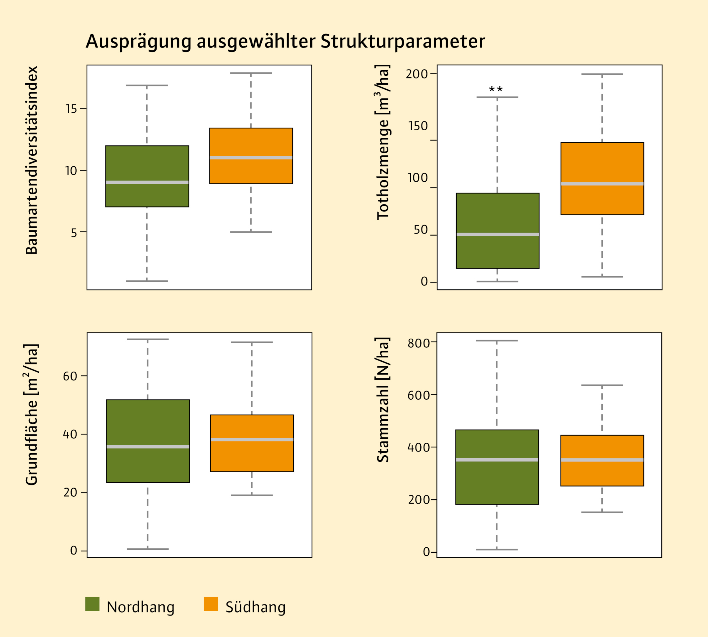 Dass es Unterschiede in der Waldstruktur zwischen Nord- und Südhang gibt, geht zum einen aus der Baumartenzusammensetzung der Versuchsflächen (siehe oben) hervor. So sind die wärmebegünstigten Sonnseiten vor allem in den mittleren Lagen durch das Vorkommen der Waldkiefer gekennzeichnet, während für die Hochlagen der Schattseiten das Auftreten Zirben-geprägter Bestände charakteristisch ist. Zum anderen unterschied sich das Angebot an stehendem und liegendem Totholz zwischen den zwei Gradienten signifikant, wobei die trockeneren und wärmebegünstigten Südhänge im Schnitt deutlich höhere Totholzmengen aufwiesen (Abbildung 5). Als Grund hierfür wird unter anderem eine höhere Baummortalität (z.B. durch Borkenkäferbefall) auf diesen Standorten, die zu phasenweiser Trockenheit neigen, angenommen. Baumartenvielfalt, Grundfläche des lebenden Bestandes sowie Stammzahlen weisen hingegen kaum Unterschiede zwischen Sonn- und Schattseiten auf.