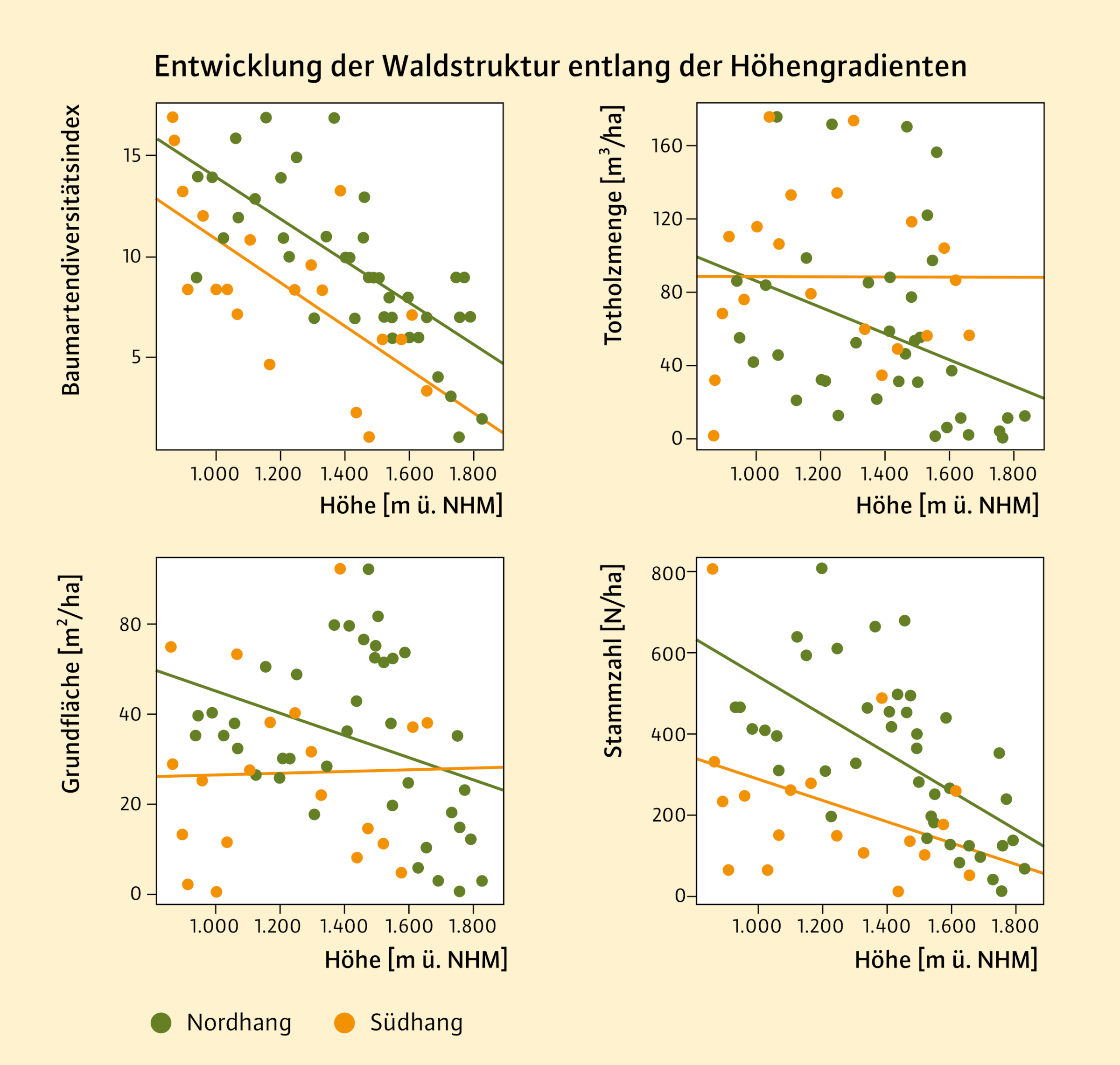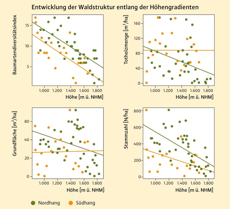 Unterschiede wurden hingegen bei der Totholzmenge und der Grundfläche des lebenden Bestandes beobachtet. Während die beiden Parameter auf den Südhängen keine Änderung über die Höhe zeigten, war auf den Schattseiten jeweils eine Abnahme mit zunehmender Höhe zu verzeichnen. Hierbei ist zu beachten, dass die Werte zwischen 800 und 1.600 m ü. NHN relativ gleichmäßig gestreut sind und erst ab 1.600 m ü. NHN stark abnehmen. Der Rückgang von Totholzmenge und Bestandesgrundfläche auf den Schattseiten resultiert vor allem aus dem dortigen Vorkommen der hochsubalpinen Lärchen-Zirbenwälder, die ab 1.600 m ü. NHN die totholz- und grundflächenreicheren Fichtenhochlagenwälder ablösen.