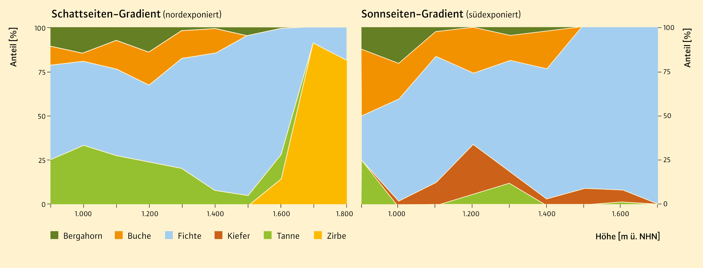 Die eher nordexponierten Hänge des Schattseiten-Gradienten (Naturwaldreservate Schrofen und Wettersteinwald) sind über weite Strecken durch einen mäßig frischen Bergmischwald aus Fichte, Tanne, Buche und Bergahorn gekennzeichnet, wobei mit zunehmender Höhenlage die Anteile der Fichte vor allem zu Lasten der Tanne zunehmen. Ab circa 1.400 m ü. NHN lösen tiefsubalpine Carbonat-Fichtenwälder die Bergmischwälder ab. Diese gehen ab 1.600 m ü. NHN in einen Zirbenwald (Vaccinio-Pinetum cembrae) mit Zirbe als Haupt- und Fichte als Nebenbaumart über (Abbildung 3). Die für diesen Waldtypus eigentlich typische Lärche fehlt in diesem Gebiet weitestgehend.