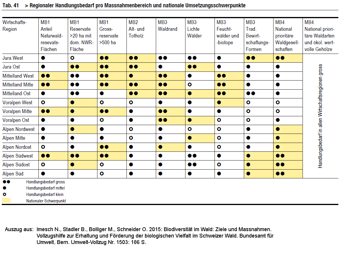 Demnach ist zum Beispiel in den südlichen Alpenregionen die Förderung und Erhaltung national prioritärer Waldgesellschaften von zentraler Bedeutung. In den mittleren und östlichen Voralpen sowie im Mittelland und im westlichen Juragebiet ist die Förderung von natürlich strukturierten Waldrändern ein wichtiger Umsetzungsschwerpunkt. Die Unterstützung von national prioritären Waldarten und ökologisch wertvollen Gehölzen hat in der ganzen Schweiz eine hohe Priorität, während insbesondere im Mittelland der Mangel an Feuchtwäldern und Biotopen gross ist.