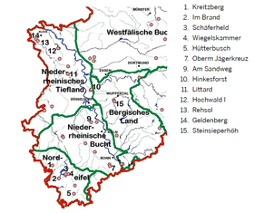 In die Untersuchung wurden neun Naturwaldzellen mit Buchenwaldgesellschaften und vier NWZ mit Stieleichen- Hainbuchenwäldern einbezogen. Die untersuchten Standorte der buchengeprägten NWZ befinden sich in Wuchsgebieten der Nordeifel (NWZ 1 Kreitzberg, NWZ 2 Im Brand, NWZ 3 Schäferheld, NWZ 4 Wiegelskammer, NWZ 5 Hütterbusch), des Niederrheinischen Tieflandes (NWZ 12 Hochwald I, NWZ 13 Rehsol, NWZ 14 Geldenberg) und des Bergischen Landes (NWZ 15 Steinsieperhöh) (Abbildung 1). Die Standorte der Stieleichen-Hainbuchenwälder liegen in den Wuchsgebieten Niederrheinische Bucht (NWZ 7 Oberm Jägerkreuz, NWZ 9 Am Sandweg) und Nieder- rheinisches Tiefland NWZ 10 (Hinkesforst, NWZ 11 Littard) (Abbildung 2).
